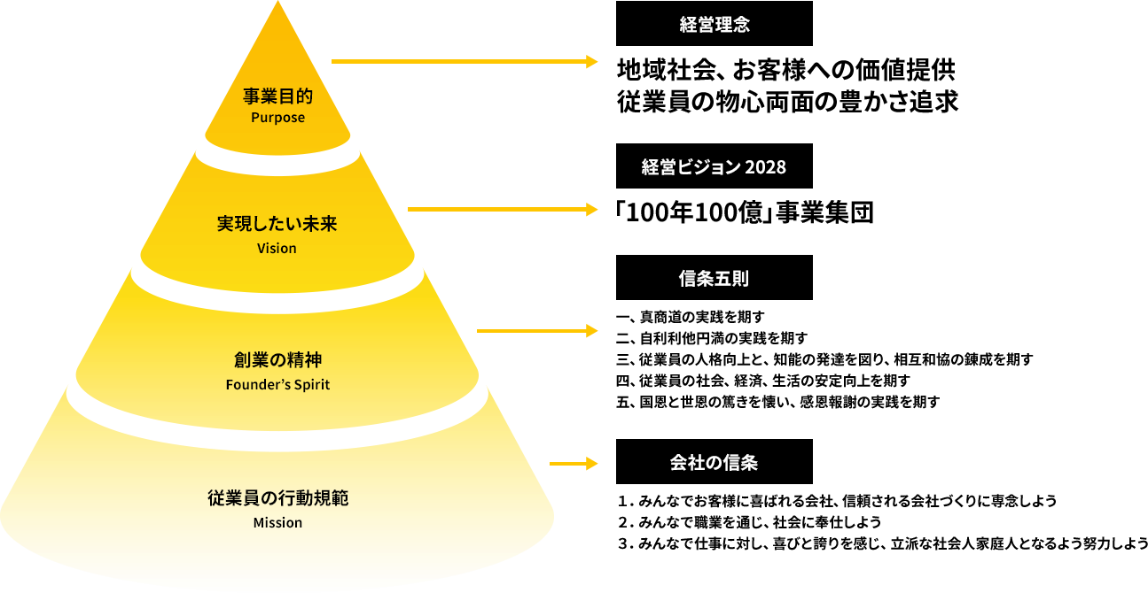 当社は事業により利益を得ますが、利益は唯一の目的ではありません。顧客満足と利益を両立し、価値提供により顧客を創造し続けます。また、当社の事業は地域社会やお客様に支えられ、初めて成り立つものです。その恩を胸に抱き、社会と人のために事業を行います。当社で働く一日は、必ず誰かのための一日となります。