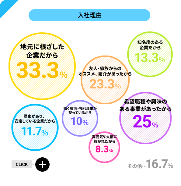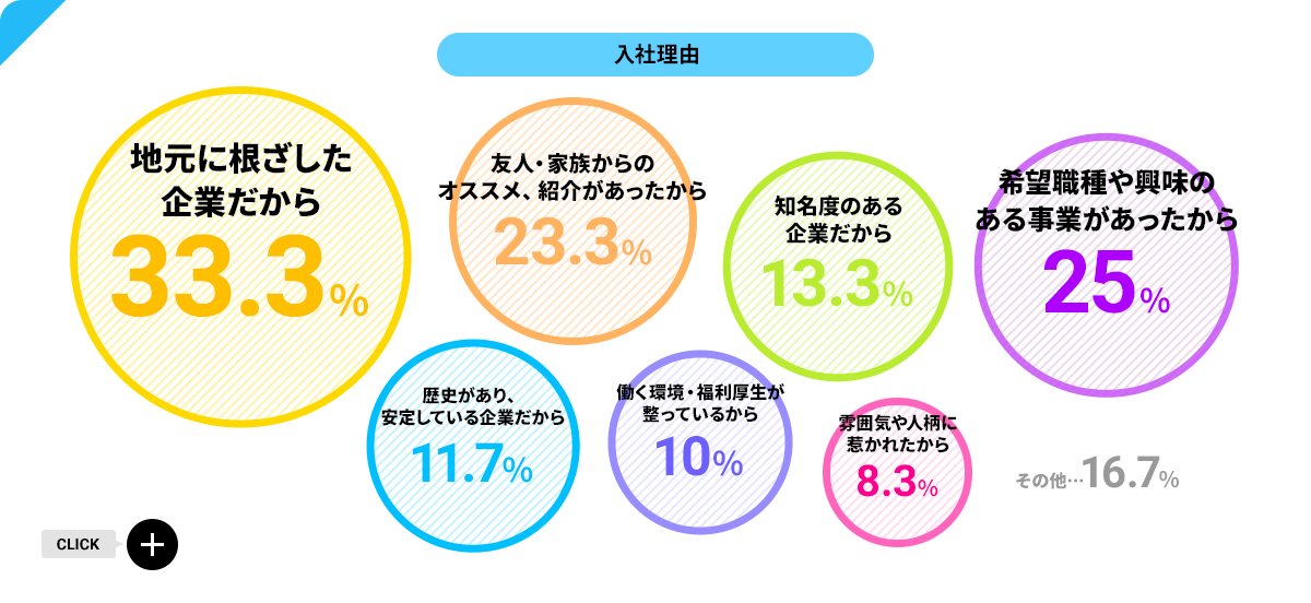 他にも「安定と挑戦の両立」「感謝祭で楽しそうに仕事しているのを見て」「面接時の合否即決に感銘を受けた」「人材教育に力をいれている」「前職までの経歴を高く評価してもらえた」「努力次第でキャリアアップが見込める」など。