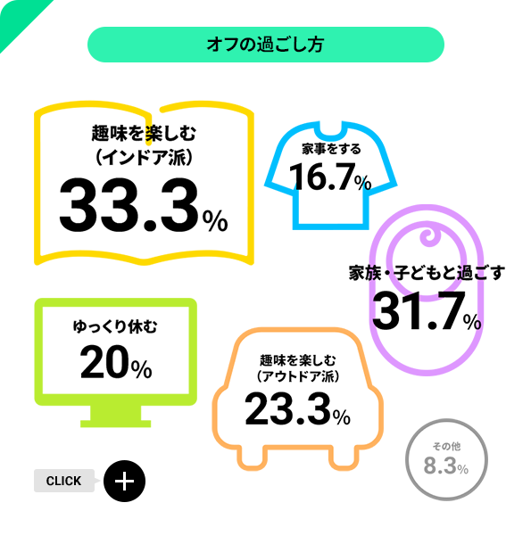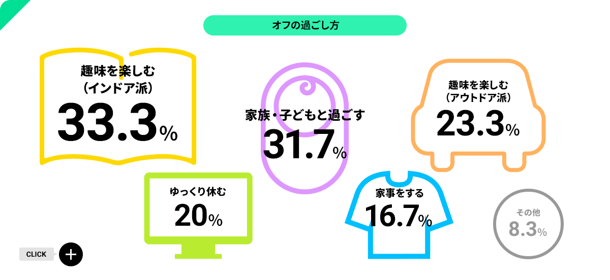 残業が少ないため、終業後は自分の趣味の時間、休みの日は家族との時間…などのように使い方を分けているメンバーも。趣味も映画鑑賞やゲーム・読書などのインドア派とスポーツやドライブ・ツーリングなどのアウトドア派と半々くらいです。