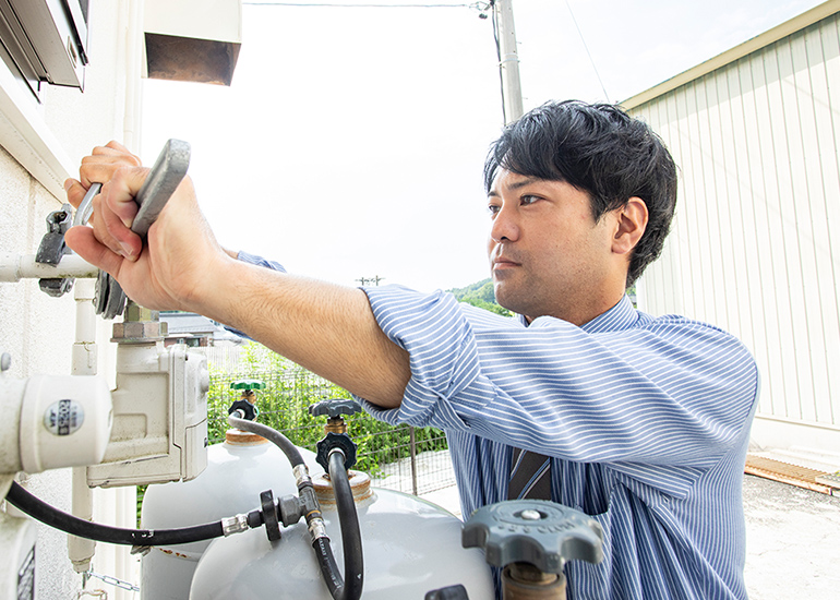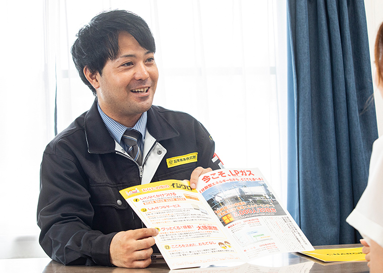 私が目標にしているのは、ガスのプロとしてお客様に信頼される営業マンになること。入社以来、ガスに関する資格を一つずつ取得し、取付工事なども自分でできるようになりましたが、今後はもっと知識やできることを増やしていきたいと考えています。石黒商事には様々な事業・職種に携わるチャンスがあります。将来的には新しい仕事にもチャレンジしていきたいと考えています。